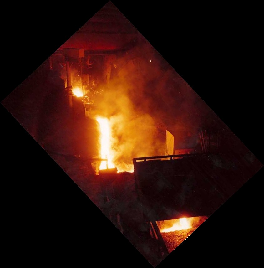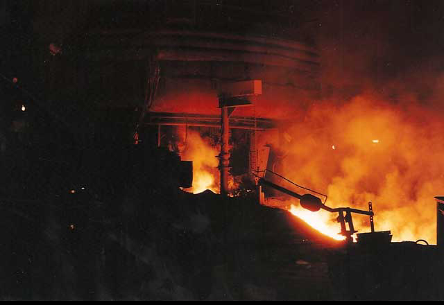 | The above picture is one where I tried to capture the whole pour in 1 shot. I turned my camera at an angle and I think it shows the whole flow from furnace into the hot metal car which was sitting under the cast house floor. |